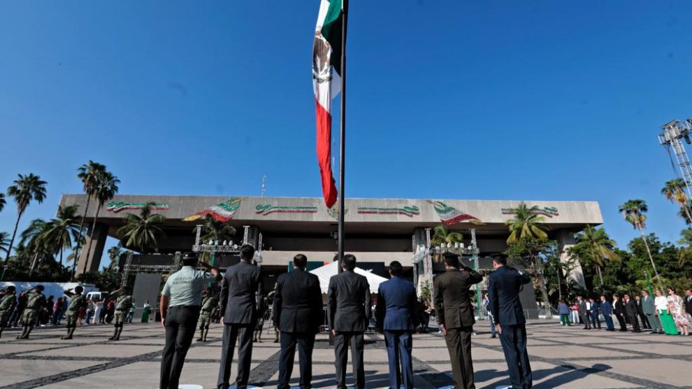 Culiacán, Sinaloa, 15 de septiembre del 2023.- Autoridades civiles y militares conmemoraron el aniversario número 213 del Grito de Independencia de México con un izamiento de bandera a toda asta y con Honores de Ordenanza en la plaza cívica de Palacio de Gobierno. En representación...